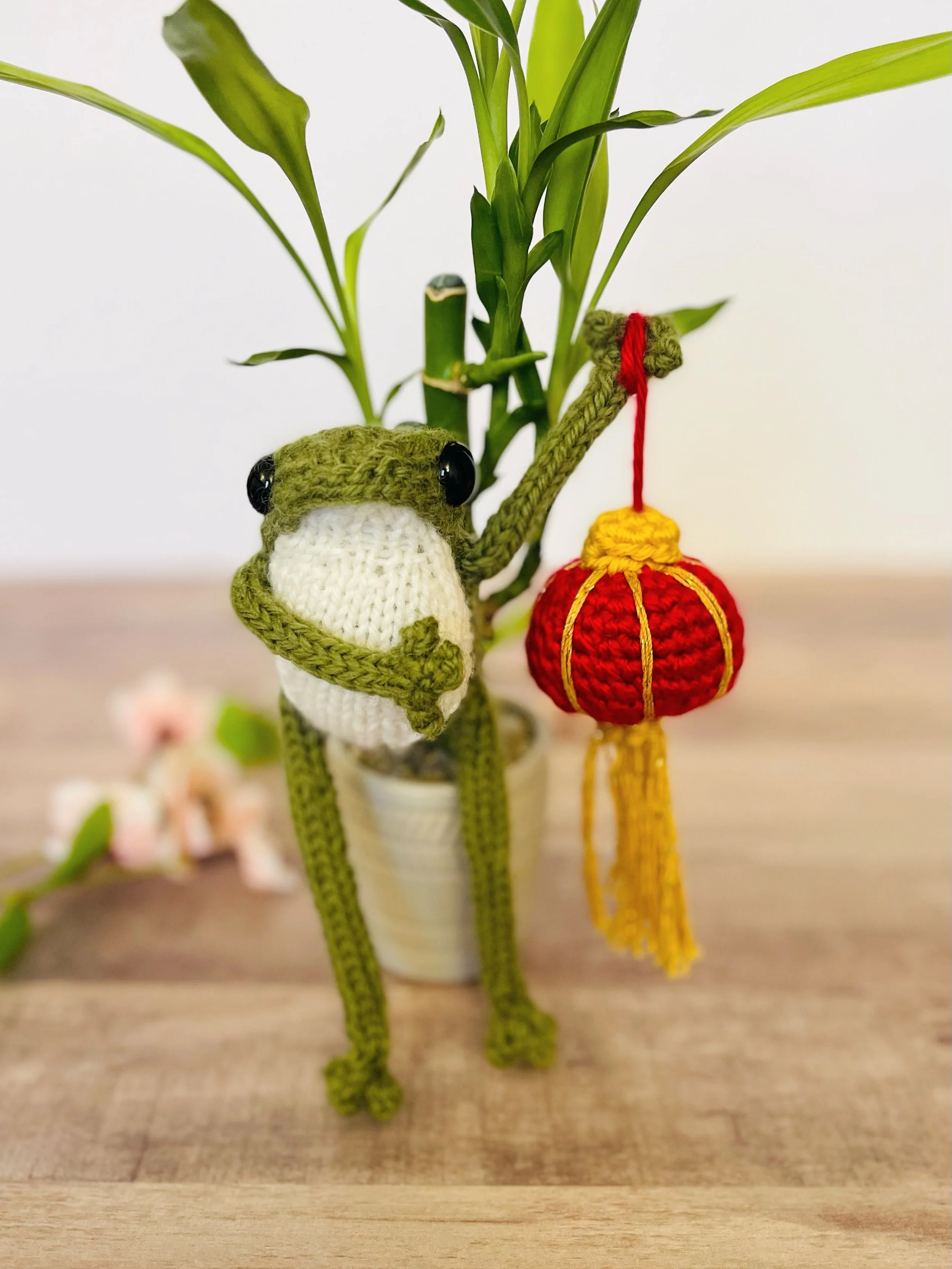Knit frog pattern: Dot Pebbles Knits, Crochet Chinese lantern pattern: Ollie Holly Crochet, Yarns: Patons Classic Wool and Caron Simply Soft